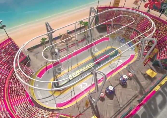 The game of Roller Champions is played on a curved, oval track with clear vertical walls on each side. Each game lasts for up to seven minutes, plus up to three minutes of overtime.